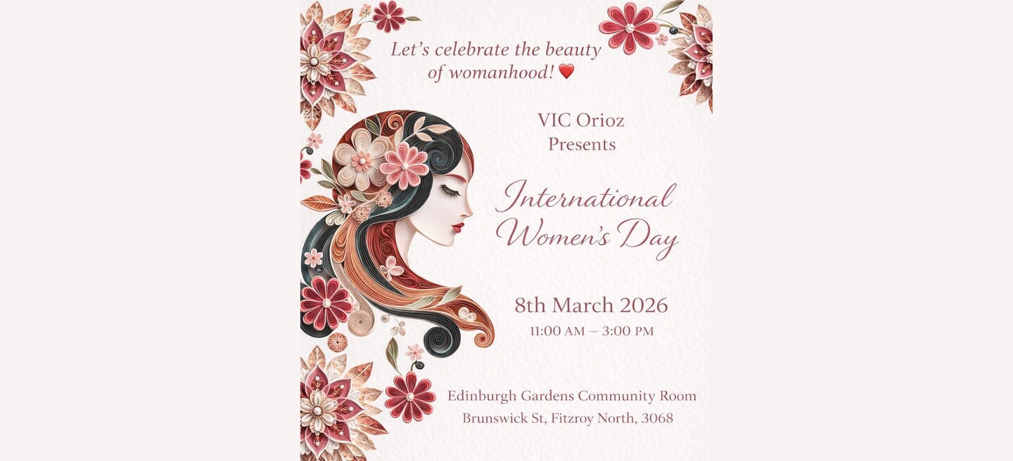 Orioz Victoria is celebrating International Womenβs Day on Sunday, 08 March 2026, with a gathering at Edinburgh Gardens.